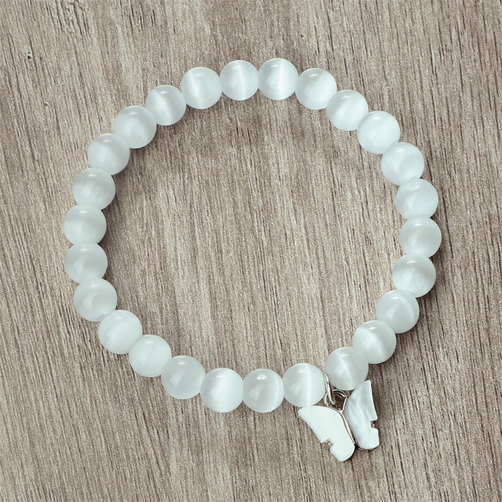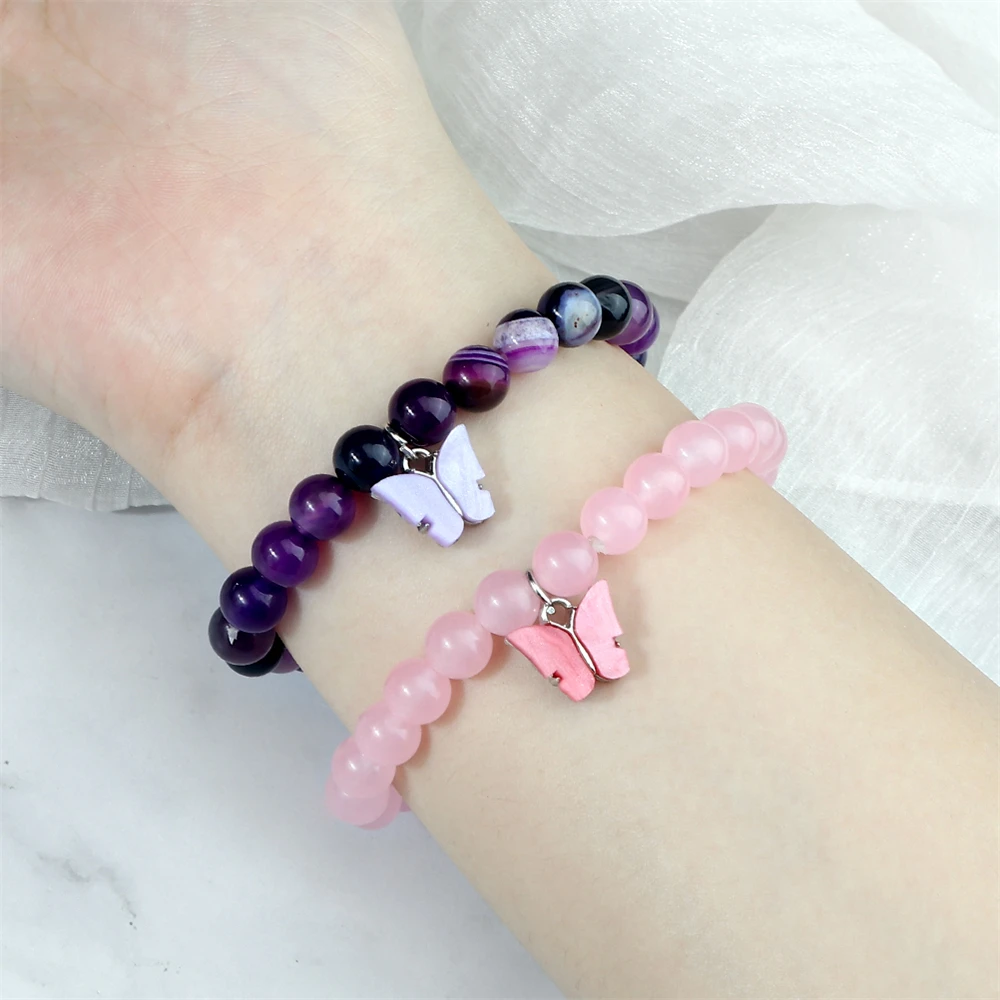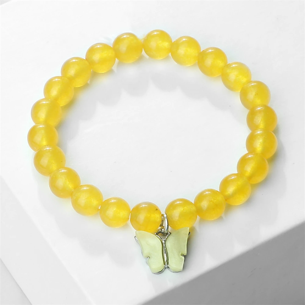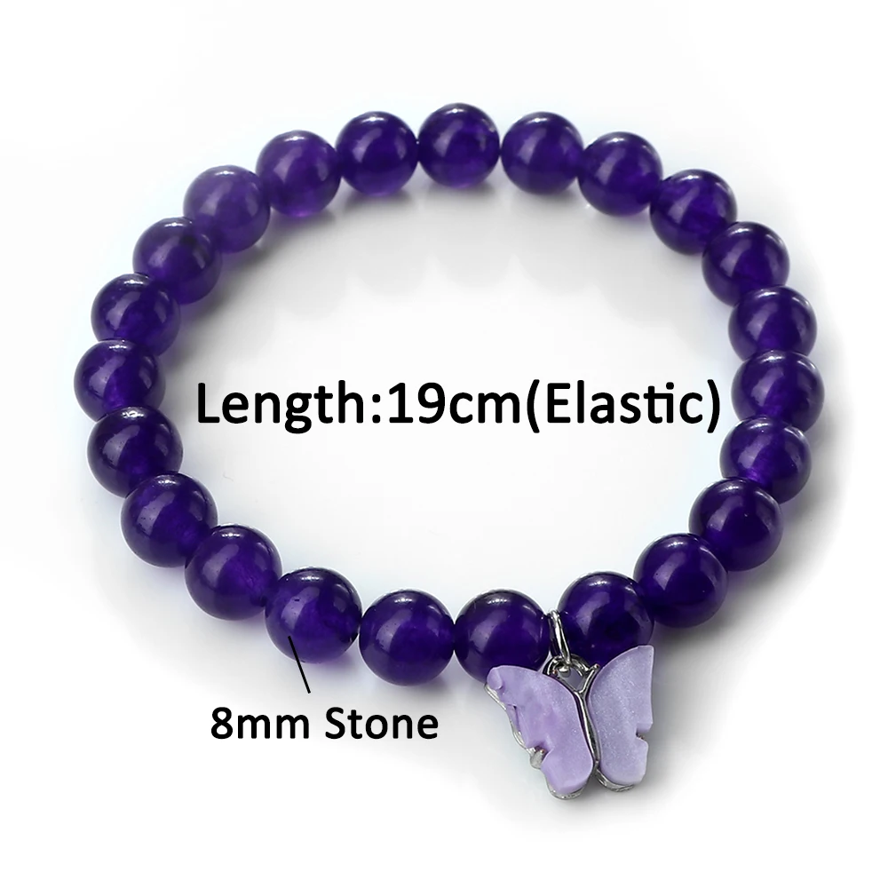 8mm Natural Agate Stone Elastic Bracelet for Men Women Chalcedony Cat Eye Beads Bangle with Acrylic Butterfly Charm Jewelry Gift
