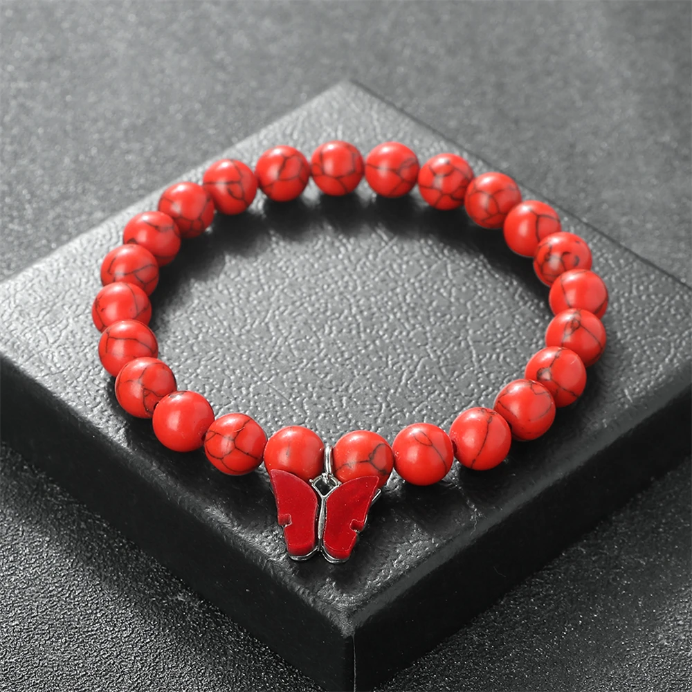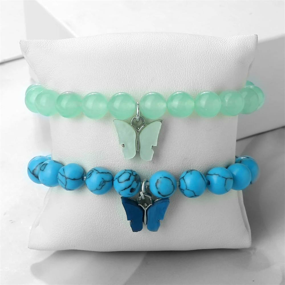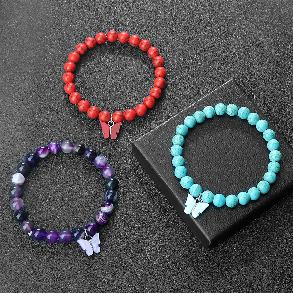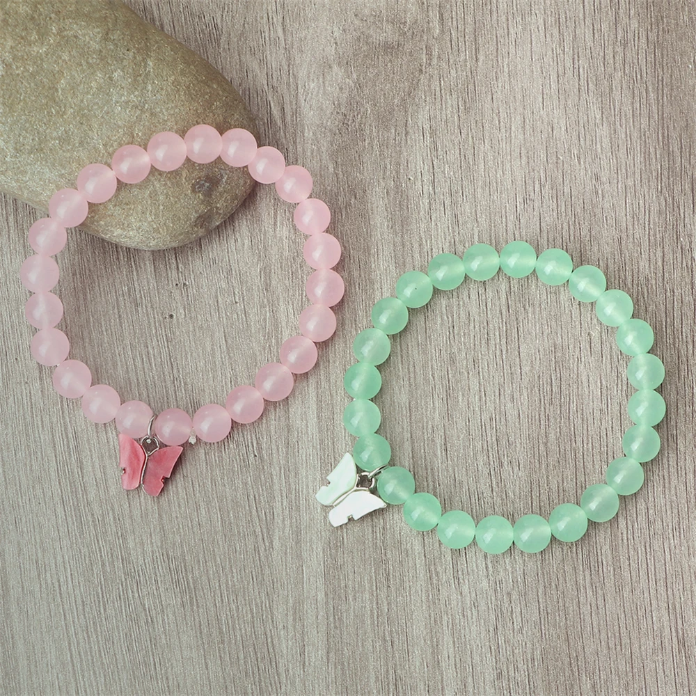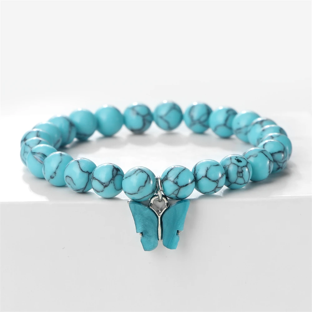 8mm Natural Agate Stone Elastic Bracelet for Men Women Chalcedony Cat Eye Beads Bangle with Acrylic Butterfly Charm Jewelry Gift